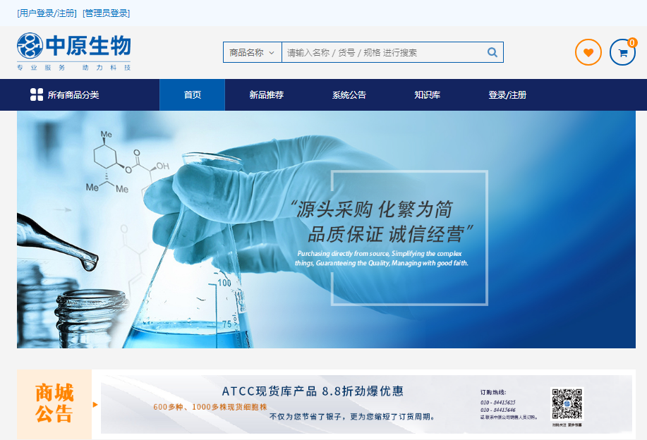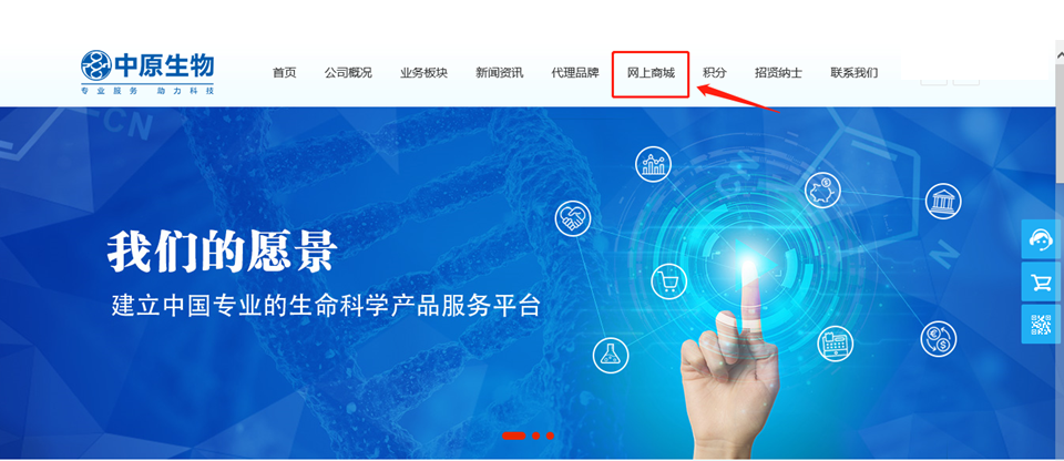 中原公司一直以“推动生命科学事业,服务于全人类健康”为使命!为客户打造优质高效,安全可靠的生命科学产品公共服务平台。面对日新月异的全球生物产业热点需求,中原公司不断提高服务水平,充分发挥自身优势,服务理念从“传统模式”向“互联网+模式”升级。中原公司网上商城于2019年5月1日正式上线,商城地址: http://shop.sinozhongyuan.com/