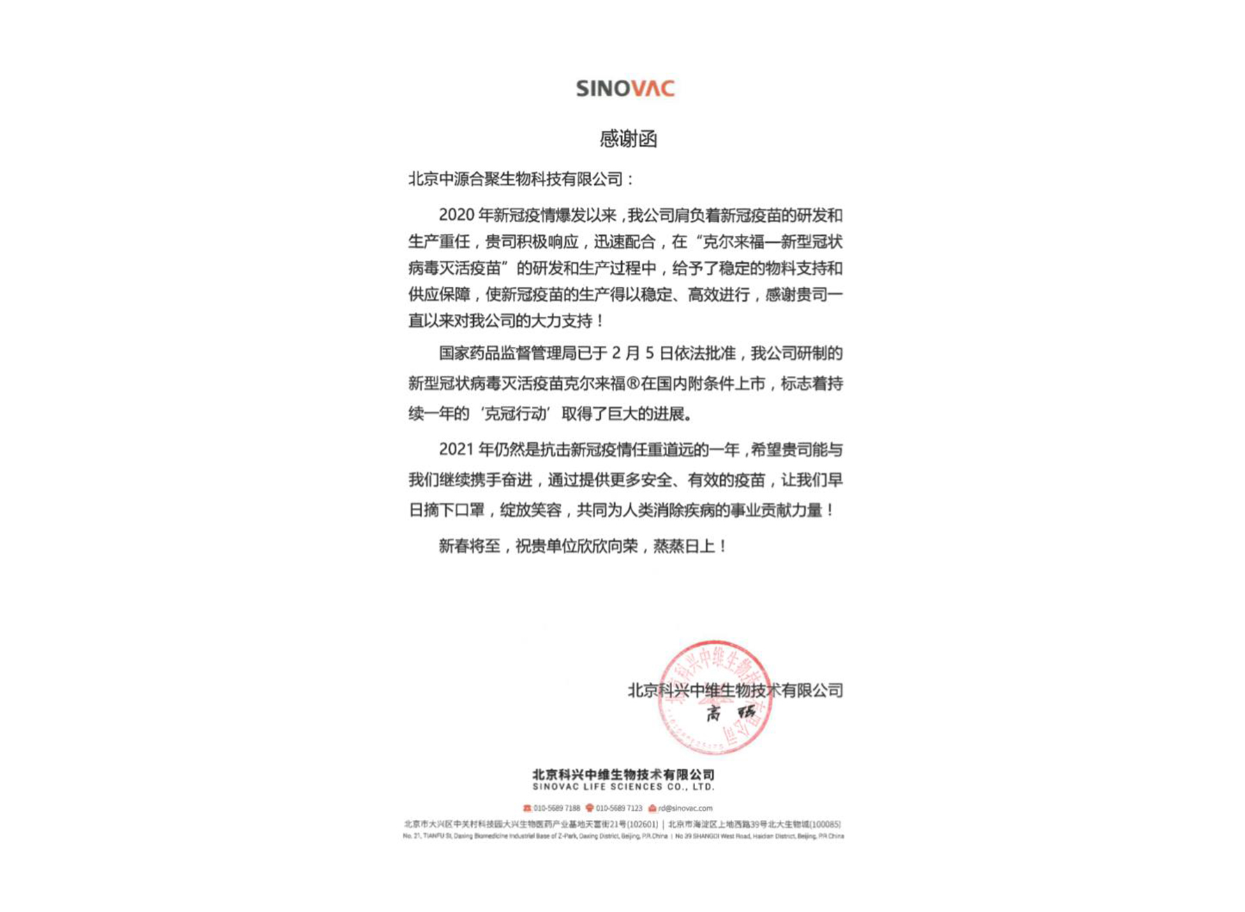2020 年是不平凡的一年,各行各业都受到疫情的重大影响。中源公司有幸在新冠疫苗的研发、生产过程中贡献一份力量,积极协调各方力量帮助北京科兴生物解决供货问题,不遗余力地助力其新冠疫苗的早日研发及生产,收到北京科兴感谢信。2021-03-09 09:08:00.0