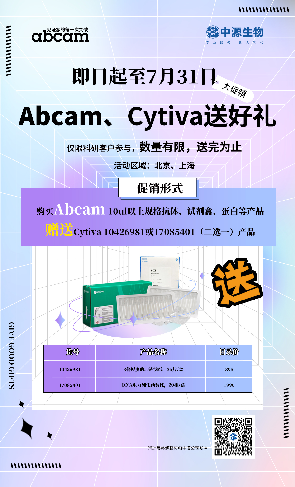 购买abcam 10ul以上规格抗体、试剂盒等产品(销售价6.5折以上)即0金额赠送1件 cytiva 10426981或17085401(二选一)产...2023-06-29 15:18:00.0