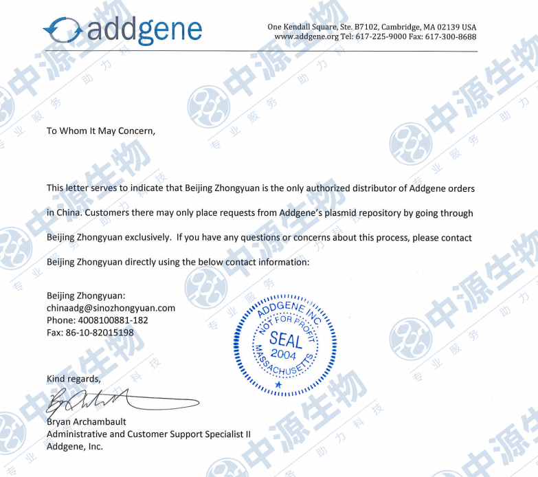 1、声明:Addgene为非赢利机构,大部分产品只能科研机构订购,请不要将货物转售给商业机构。目前中国区域授权中源公司为Addgene的唯一代理商,请选择正规途径订购。关于授权可在Addgene网站 https://www.addgene.org/ordering/international/ 上查询确认。