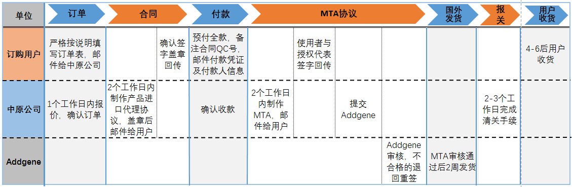 订购流程:填写订单表→生成协议→回传协议并付款→签署MTA→4周左右到货(详见以下Addgene产品订购须知)