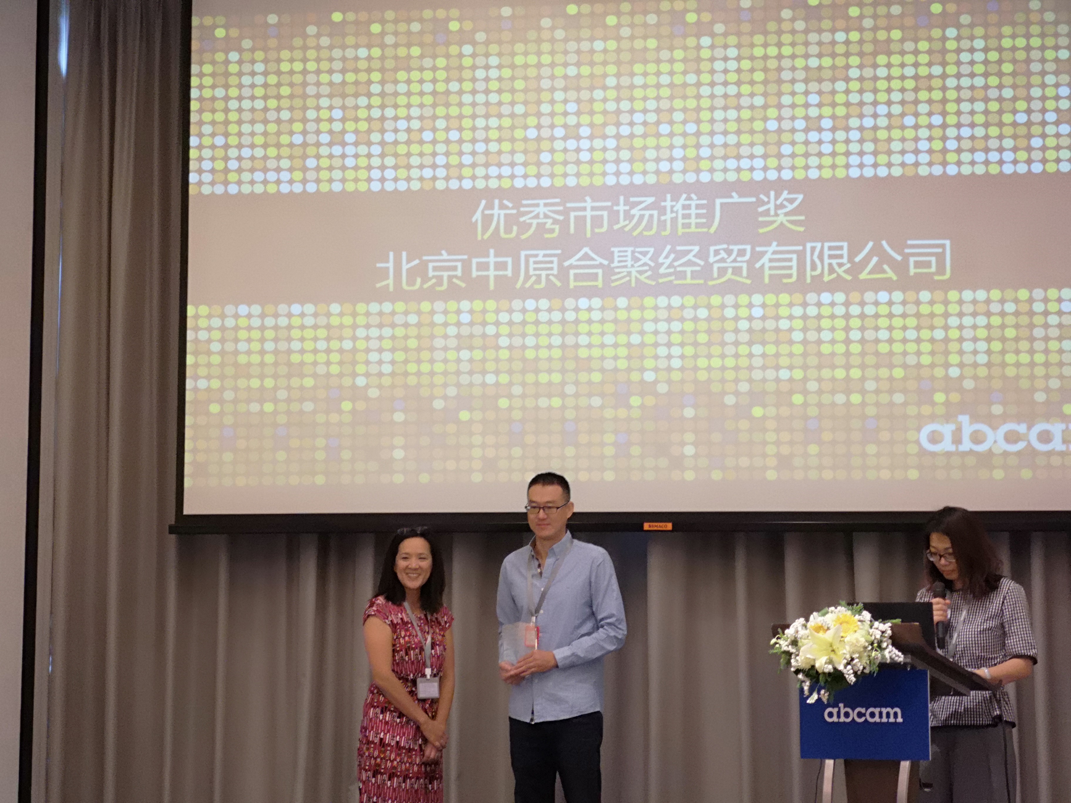 此次大会,Abcam共颁发了11个奖项,以感谢经销商伙伴在过去一年的陪伴和努力。因在市场上的突出贡献,中原公司被授予优秀市场推广奖。Abcam大力赞扬了中原的市场活动丰富多彩,网上宣传频繁多样,和配合Abcam做好各种市场活动的积极态度。最后,Abcam感谢中原公司一直以来对Abcam的大力支持,中原也将一如既往地与Abcam保持良好的合作关系,携手并进,合作共赢!