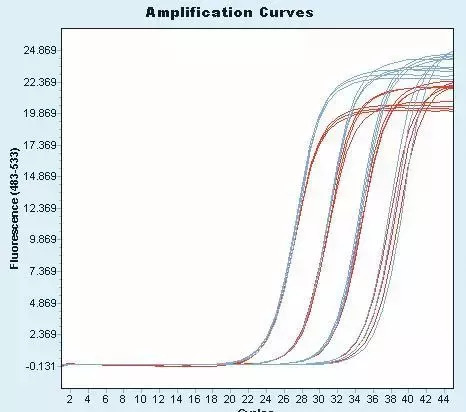人类DNA目标序列按10倍梯度稀释(10,000 - 10拷贝/孔,3次重复),PCR反应配置完成后,立即上机反应(相应结果曲线为蓝色),或在自动上样装置中放置24小时后再上机反应(相应结果曲线为红色)。两种样本的扩增曲线及相应Cp值说明:热启动酶预混反应液的性能不会被延长的放置时间所影响