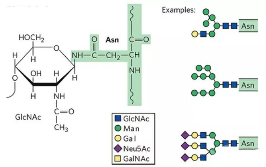 通常将糖基化分为两类:N连接的糖基化 (糖通过一个N原子连接在Asn)和O连接的糖基化 (糖通过O原子连接在Ser/Thr)。先看N-糖的生物合成,在糖苷酶的作用下,N-乙酰葡糖胺(GlcNAc)和甘露糖(Mannose)分子被连接在Asn残基上,形成N-糖的基本架构。半乳糖(Gal)、N-乙酰神经氨酸(Neu5AC)、N-乙酰半乳糖胺(GalNAc) 等分子会参与糖链形成的完整过程。