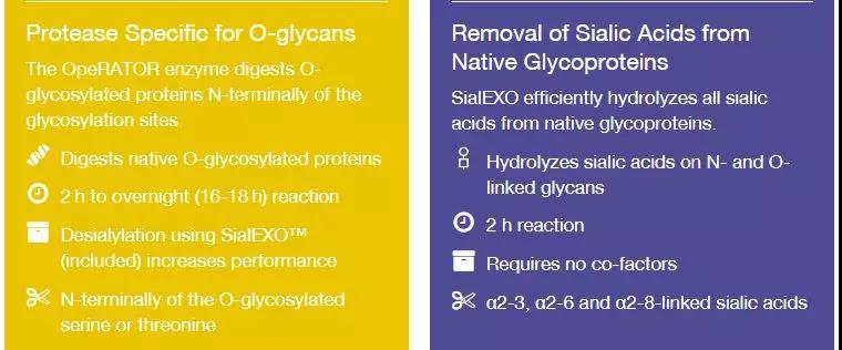 这样的O-糖位点切割酶是否对您的实验有帮助呢?我们还提供配套的试剂盒,试剂盒中提供O-糖蛋白亲和柱,OpeRATOR和SialEXO,可柱上酶切并特异性回收O-糖肽段。