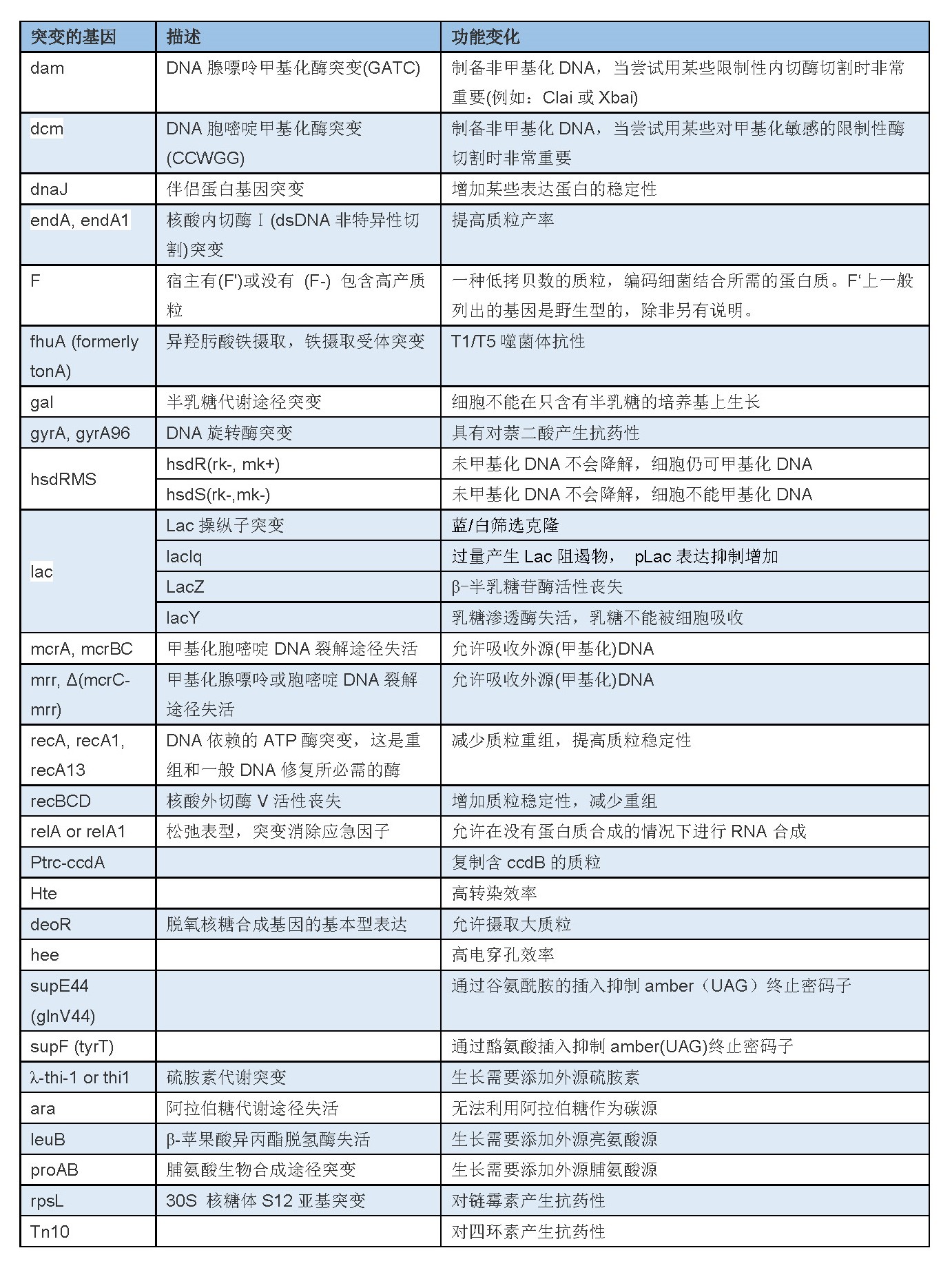 可以发现今天大多数商业菌株都是为了一些特定的目的:快速生长,高通量克隆,常规克隆,克隆不稳定的DNA,制备非甲基化DNA,等等。许多突变使这些特征成为可能,并存在于大多数商业菌株中,尤其是那些能使质粒产量和/或DNA质量提高的突变。下面的表1列出了一些比较常见的大肠杆菌基因突变情况。
