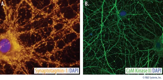 在 E18 大鼠海马神经元无血清培养基中添加 N21-MAX Media Supplement(货号 AR008 ),显示突触标记物 Synaptotagmin(抗体货号 MAB4364 )和 CAM Kinase II(抗体货号 MAB5584 )的稳定表达。