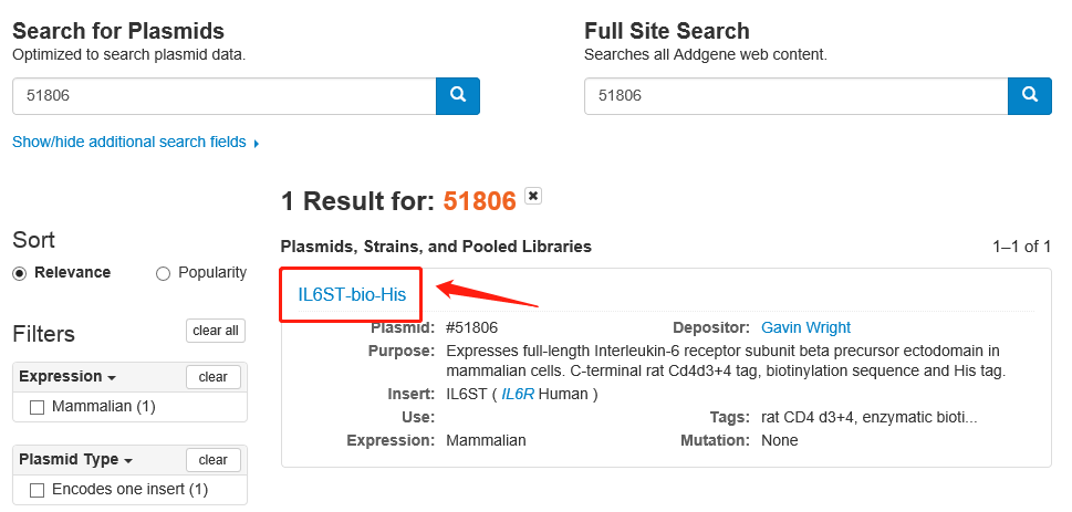 First, enter the plasmid number: 51806 in the search field on the homepage of Addgene's official website to search. The result is as shown below. Click on the blue plasmid name to enter the specific page of the relevant plasmid.