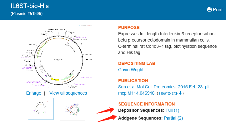 After entering the relevant plasmid page, you can see that there are three yellow headings on the right side of the plasmid map, and the last one is Sequence Information, which is the information about the plasmid sequence. Depositor Sequences is the sequence that the original holder of the plasmid uploads to Addgene. Partial means that the author only picks up part of the sequence information when uploading the sequence; Addgene Sequences is the result of sequencing the plasmid by Addgene. Full means that Addgene provides the full sequence information of the plasmid. After clicking on the relevant link, you can go to the specific sequence page.